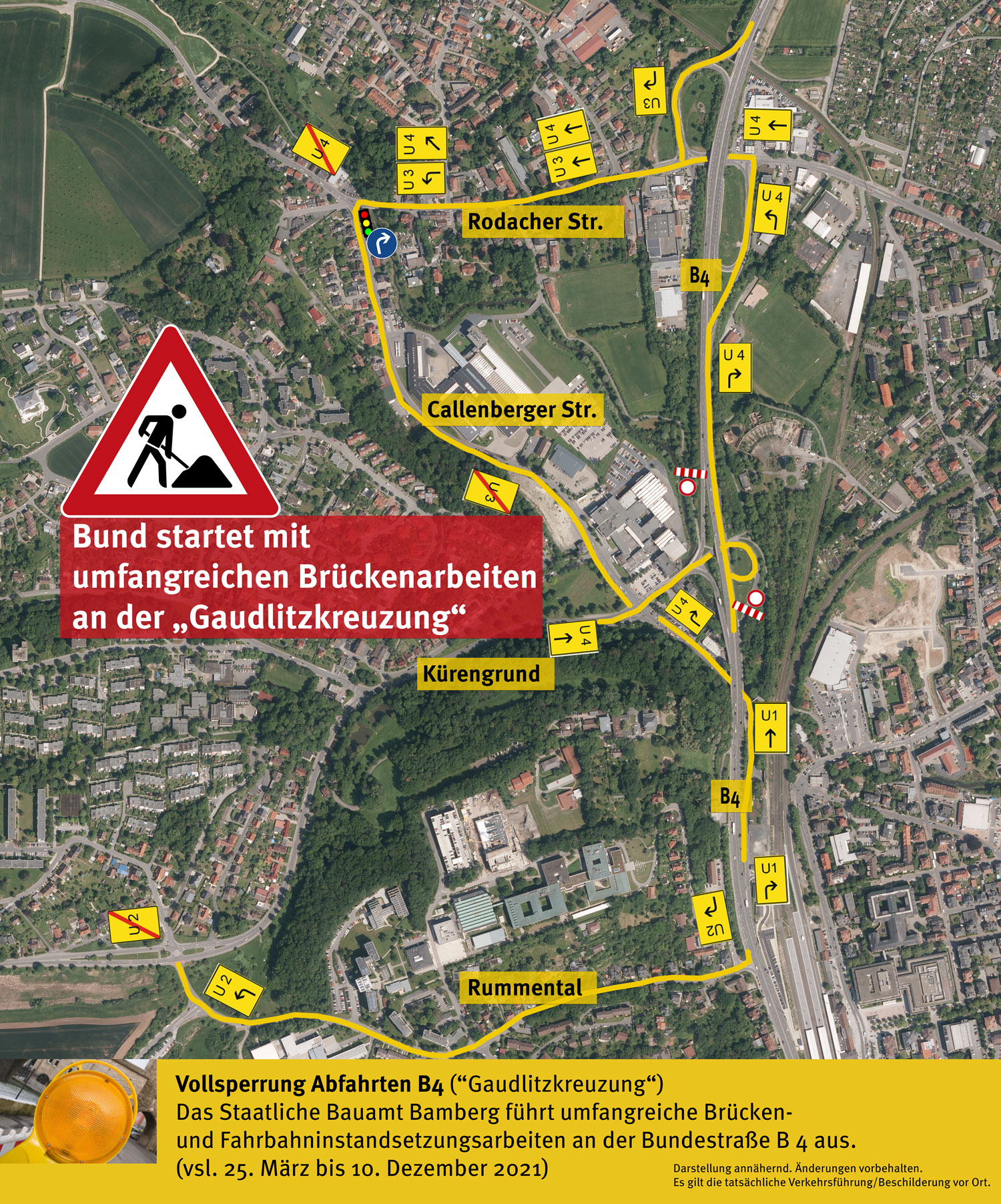 Das Staatliche Bauamt Bamberg führt von 25. März bis vsl. 10. Dezember 2021 umfangreiche Brücken- und Fahrbahninstandsetzungsarbeiten an der Bundestraße B 4 an der Anschlussstelle St 2202 (Anschlussstelle “Gaudlitz“) in Coburg durch.