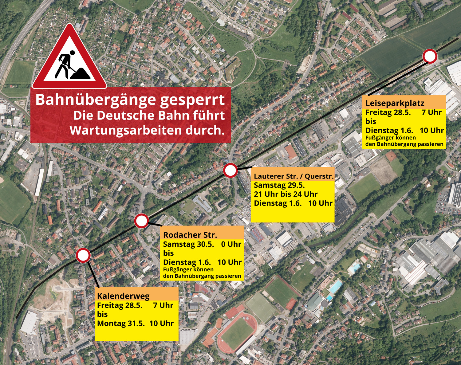 Die Deutsche Bahn führt ihre turnusmäßigen Wartungsarbeiten an den Bahnübergängen der Strecke Neustadt b. Coburg/Coburg durch. Deshalb werden folgende Bahnübergänge gemäß Zeitplan gesperrt: