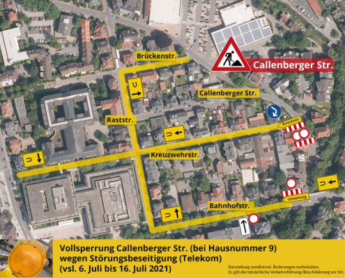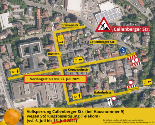 Wegen Störungsbeseitigung (Telekom) kommt es ab Dienstag (6. Juli bis vsl. 27. Juli) zur Verlängerung der Vollsperrung der Callenberger Str. (bei Hausnummer 9).
