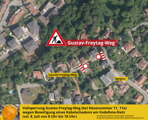 Wegen Beseitigung eines Kabelschadens am Vodafone-Netz kommt es am Donnerstag, 8. Juli von 8 Uhr bis 18 Uhr zur Vollsperrung des Gustav-Freytag-Weg (bei Hausnummer 11 u. 11a).