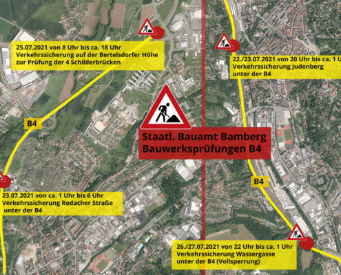 Wegen verschiedener Bauwerksprüfungen kommt es ab Montag (19. Juli bis vsl. 28. Juli) zu halbseitigen Straßensperrungen auf der B4.