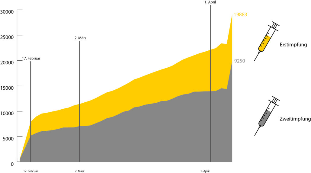 Die Impfzahlen sind in der vergangenen Woche geradezu in die Höhe geschossen. Insgesamt gab 5486 Erstimpfungen im Impfzentrum und in den Arztpraxen. Zweitimpfungen wurden insgesamt 396 verabreicht. Die Impfquote beträgt somit aktuell 15,6 Prozent, das entspricht einem Plus von 4,2 Prozent. Ein Rekordwert seit Impfbeginn am 29. Dezember. Wie immer wurden im Impfzentrum von Coburg Stadt und Land alle zur Verfügung stehenden Dosen verimpft.