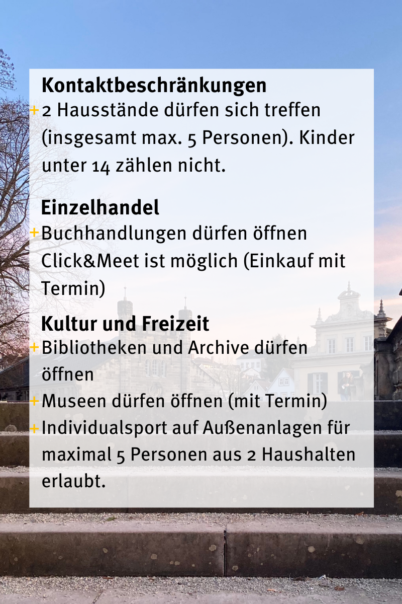 • Nach den ersten Öffnungen bei Schulen, Friseuren und in einzelnen weiteren Bereichen werden ab dem 8. März 2021 Buchhandlungen dem Einzelhandel des täglichen Bedarfs zugerechnet. Sie können somit auch mit entsprechenden Hygienekonzepten und einer Begrenzung auf einen Kunden je 10 m² für die ersten 800 m² Verkaufsfläche und darüber hinaus einen Kunden je 20 m² wieder öffnen. Unter gleichen Voraussetzungen werden Büchereien, Archive und Bibliotheken wieder geöffnet. - Öffnung des Einzelhandels für Terminshopping-Angebote („Click & meet“), wobei eine Kundin oder ein Kunde pro angefangene 40 m² Verkaufsfläche nach vorheriger Terminbuchung für einen fest begrenzten Zeitraum mit Kontaktnachverfolgung zugelassen werden kann.