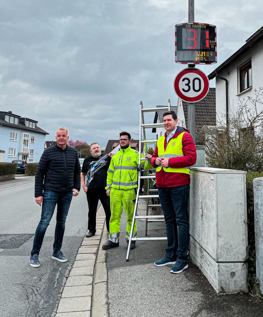 Oberbürgermeister Dominik Sauerteig hat das erste von zehn neuen Geschwindigkeitsdisplays in der Von-Merklin-Straße in Scheuerfeld angebracht. Die Anschaffung der Displays ist ein Wunsch, den viele Bürgerinnen und Bürger während der Stadtteilspaziergänge an den OB herangetragen haben.