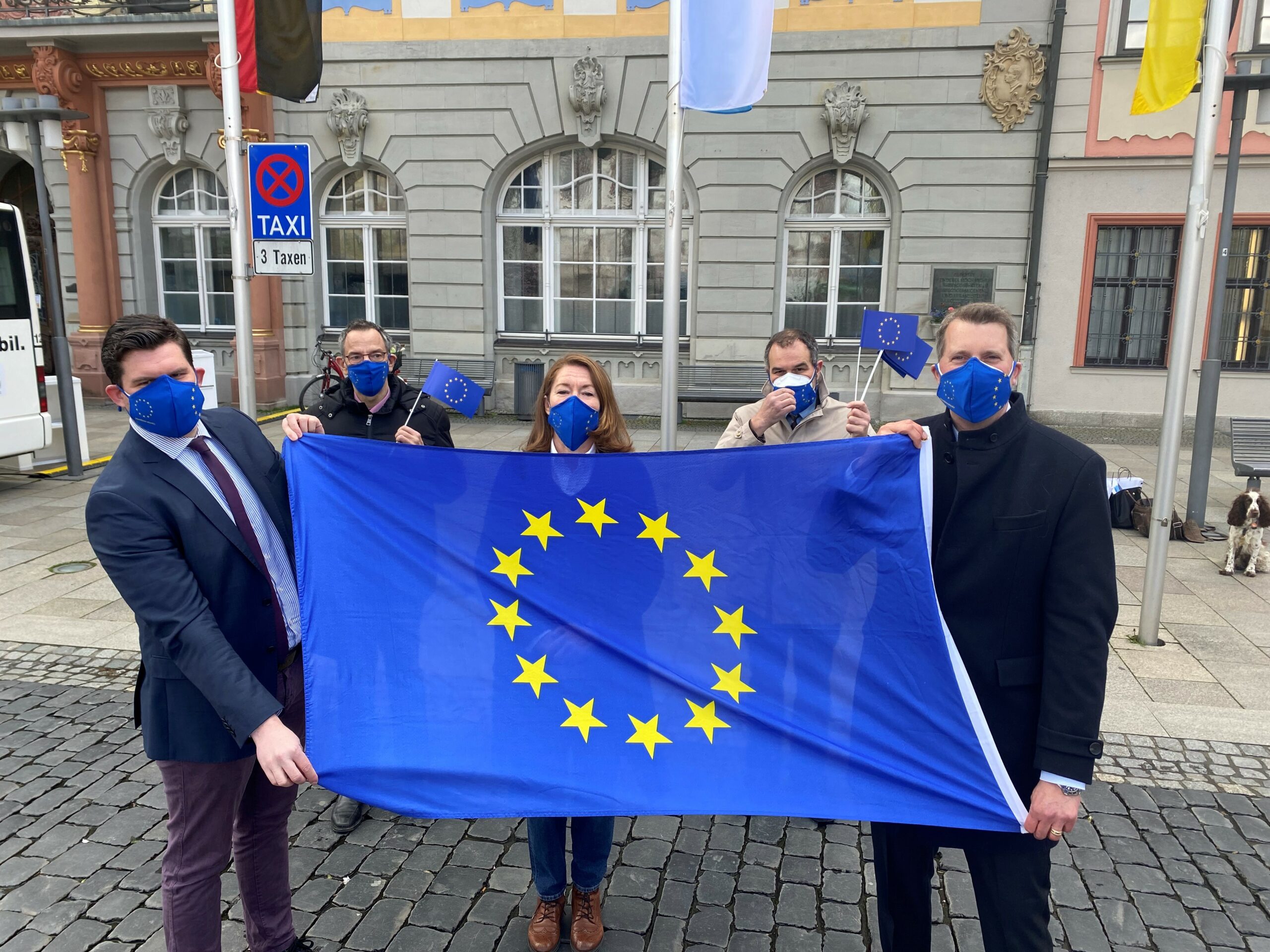 Am Freitagmittag zeigten Oberbürgermeister Dominik Sauerteig, Bürgermeister Thomas Nowak, Erbprinz von Sachsen-Coburg und Gotha und das Team Europe Direct Coburg (Rainer Maier, Geschäftsführer der VHS Coburg Stadt und Land, ED-Managerin Iris Kroon-Lottes) Flagge und feierten im Rahmen eines Pressegesprächs die Fortführung des Europe Direct Informationsbüros in Coburg.