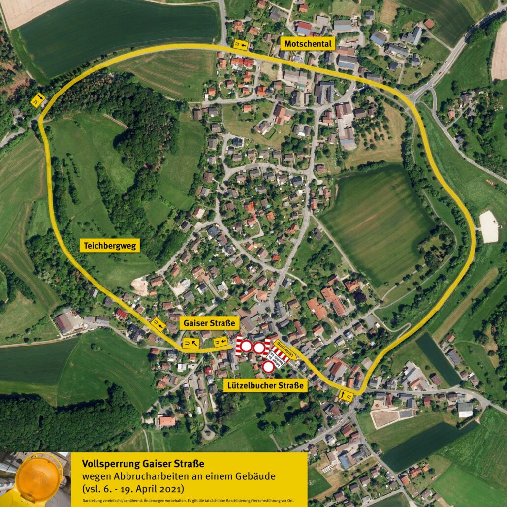 Aufgrund von Abrissarbeiten an einem Gebäude ist die Gaiser Straße ab kommenden Dienstag, 6. April 2021, auf Höhe der Hausnummer 7 für vsl. zwei Wochen voll gesperrt.
