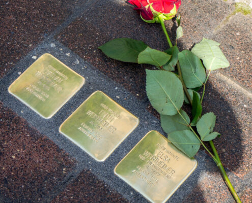 Die Stolpersteine werden jeweils vor dem Haus verlegt, in dem die Menschen zuletzt gelebt oder gewirkt haben. In der Raststraße 6 lebte bis 1938 die jüdische Familie Wertheimer, bis sie nach Argentinien auswanderte, weil das Leben in der ersten nationasozialistischen Stadt unerträglich wurde. Nun erinnern dort Stolpersteine an Elsa Wertheimer (Pate Mario Levy, ein Nachfahre aus Israel), Nathan Wertheimer (Pate George Levy, ein Nachfahre aus Israel), Edith Wertheimer (Nachfahrin aus Argentinien).
