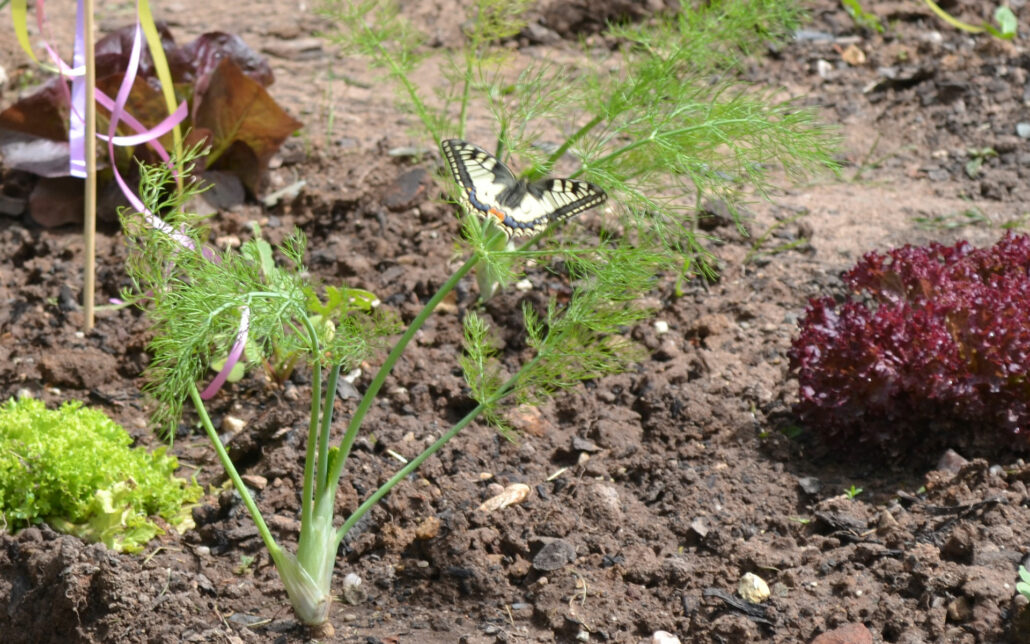 Auch Walderdbeeren sollen noch folgen. Peter Ehrl, der sich organisatorisch um den Summ-O-Maten kümmert, hatte ein paar Schachteln mit dem bienenfreundlichen Sum-Sala-Bim Samenmix dabei. Wie zum Beweis, dass dieser Schulgarten auch gut für die Artenvielfalt in Coburg seinen kann, stattete ein Schwalbenschwanz den Schüler*innen ebenfalls einen Besuch ab.
