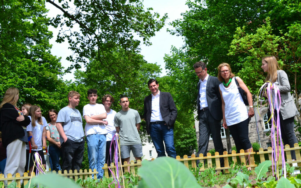 Dass Gemüse nicht nur aus dem Supermarkt kommt, lernen Schüler*innen der 7M der Heiligkreuzschule in Coburg jetzt nicht nur aus Bücher. Seit April bewirtschaften sie einen kleinen Schulgarten. Die AOK Direktion Coburg unterstützt diese Open Air Ackerschule. Stefan Sauerteig, Klimaschutzbeauftragter der Stadt Coburg, und Peter Ehrl von Ernst Kühner, spendierten Samen für Walderdbeeren, finanziert aus den Einnahmen des Summ-O-Maten am Schlossplatz.