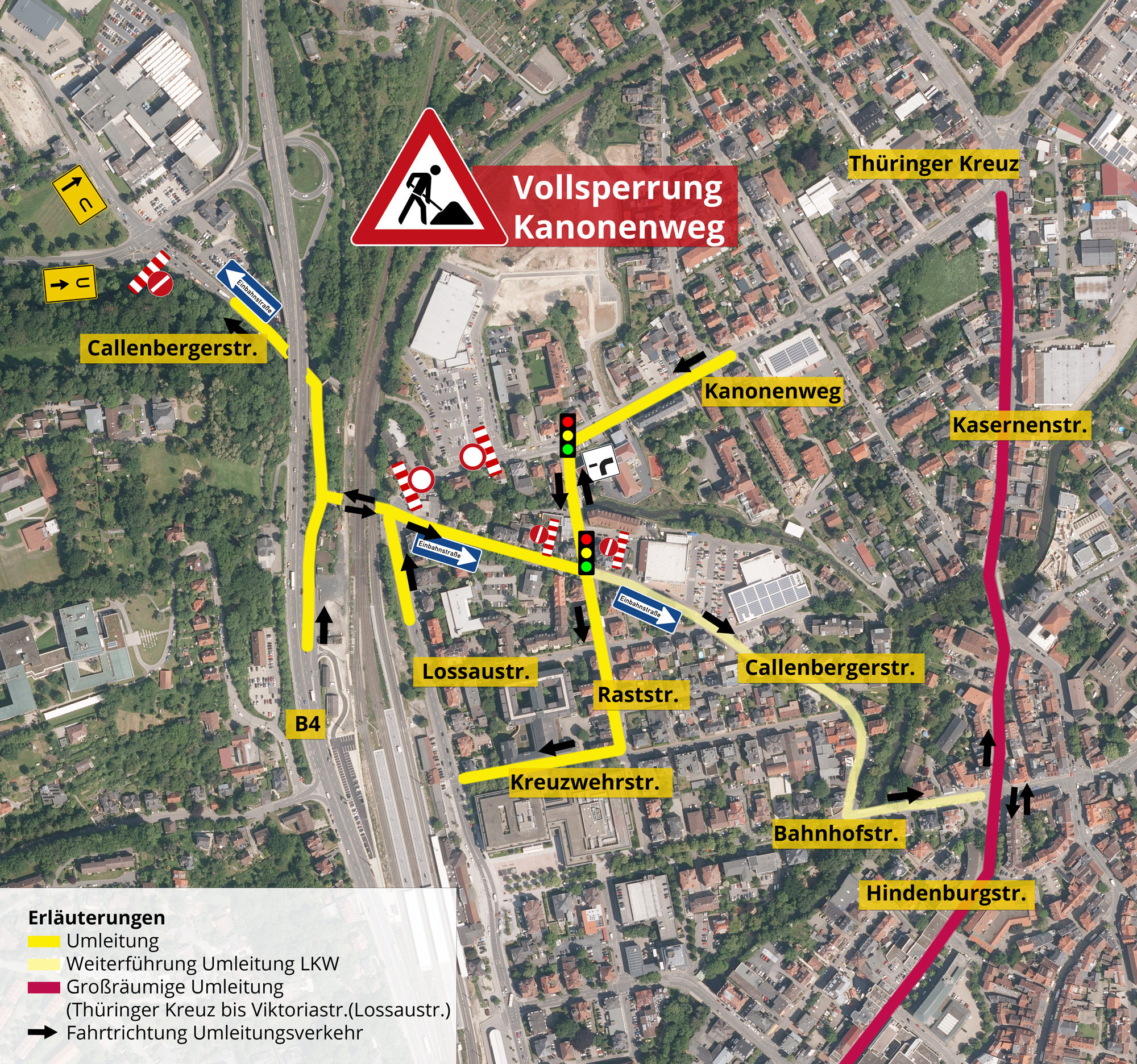 Ortskundige Autofahrer*innen können den Bereich auf einer Umleitung umfahren. Sie führt vom Thüringer-Kreuz in Viktoria- und Lossaustraße. Diese Umleitung entlastet zusätzlich die Ampeln rund um den Kanonenweg. Deswegen bittet das Ordnungsamt Autofahrer*innen, wann möglich, auf diese Strecke auszuweichen.
