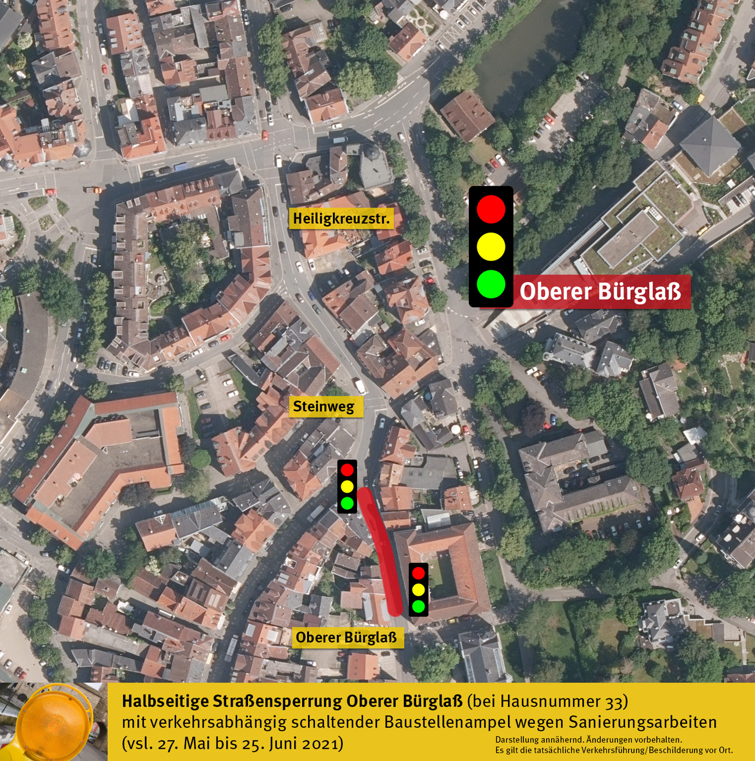 Wegen Sanierungsarbeiten kommt es am Oberer Bürglaß (bei Hausnummer 33) ab Donnerstag, 27. Mai bis vsl. 25. Juni 2021 zur halbseitigen Straßensperrung mit verkehrsabhängig schaltender Baustellenampel.