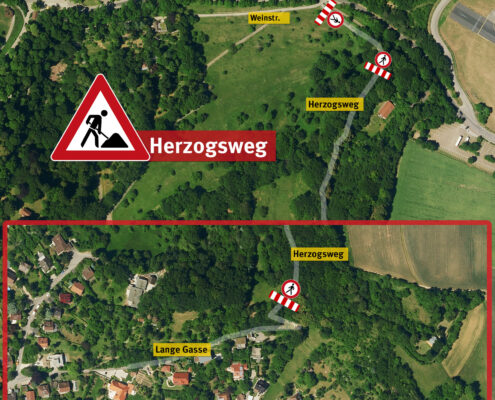Für dringende Baumfällarbeiten kommt es ab Mittwoch (21. April bis vsl. 23. April) zur Vollsperrung des Herzogsweg (im Bereich Festungshof).