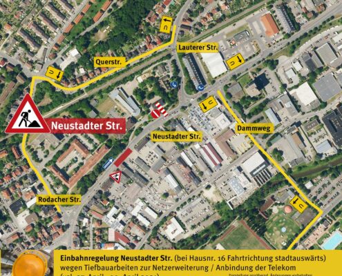 Telekom erfordert ab Dienstag (27. April bis vsl. 30. April) die Einbahnregelung (stadtauswärts) der Neustadter Str. bei Hausnummer 19.