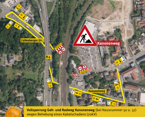 Die Behebung eines Kabelschadens (20kV) erfordert ab Freitag (9. April bis vsl. 23. April) die Vollsperrung des Geh- und Radweges Kanonenweg / Callenberger Str.