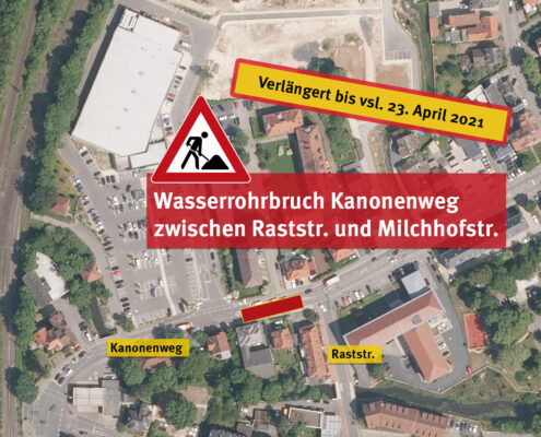 Aufgrund eines Wasserrohrbruches im Kanonenweg ist dieser zwischen der Raststraße und der Milchhofstraße nur noch in Richtung Bahnhof befahrbar.