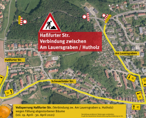 Für die Fällung abgestorbener Bäume im Bereich Haßfurter Str. (Verbindung zw. Am Lauersgraben und Hutholz/Scheuerfeld) kommt es ab Montag (19. April bis vsl. 30. April) zur Vollsperrung.
