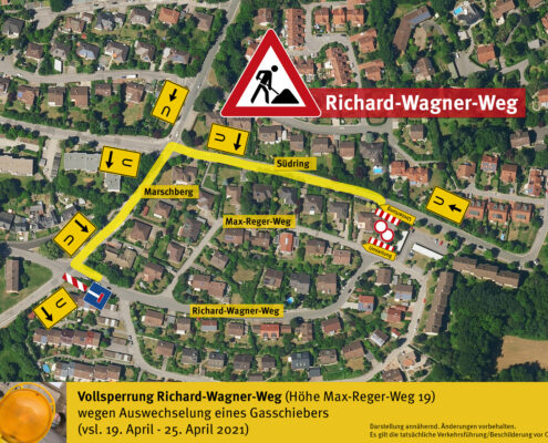Die Auswechselung eines Gasschiebers erfordert ab Montag (19. April bis vsl. 25. April) die Vollsperrung des Richard-Wagner-Weg (auf Höhe Max-Reger-Weg 19).