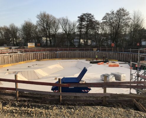 Die Arbeiten an der Globe-Baustelle liegen voll im Plan. Neben der späteren runden Form ist auch der Orchestergraben schon zu erkennen.
