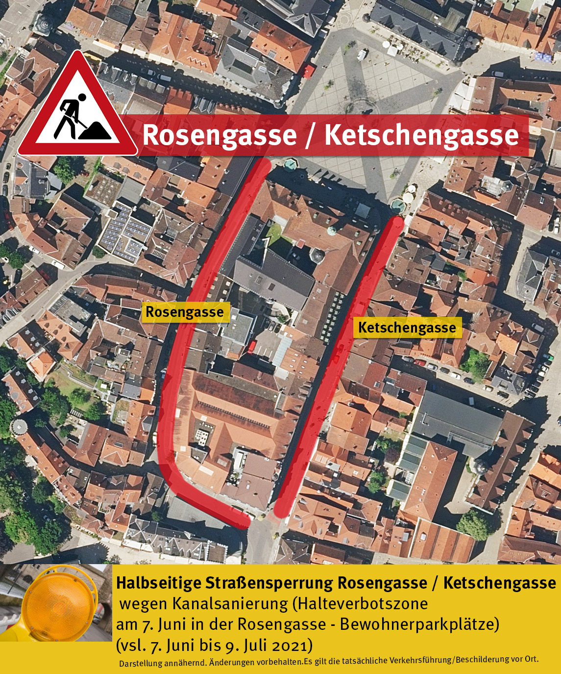 Wegen Kanalsanierung kommt in der Rosengasse / Ketschengasse ab Montag, 7.Juni bis vsl. 9. Juli 2021 zur halbseitigen Straßensperrung.