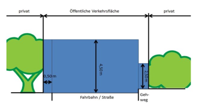 Ragen Bäume über die Grundstücksgrenze hinaus, so müssen Zweige, die das Vorbeigehen oder –fahren behindern oder gefährden, entsprechend entfernt werden. Im Bereich von Geh- und Radwegen ist hierbei eine lichte Durchgangshöhe von mindestens 2,50 Metern einzuhalten. Unter 2,50 Metern dürfen keine Äste auf dem Gehweg ragen. Der Rückschnitt muss bis zur Grundstücksgrenze erfolgen. Für den Kfz-Verkehr muss die Durchgangshöhe mindestens 4,50 Meter betragen. Sofern zwischen Fahrbahn und Grundstück kein Gehweg vorhanden ist, darf ein Sicherheitsraum von 0,50 m eingehalten werden.