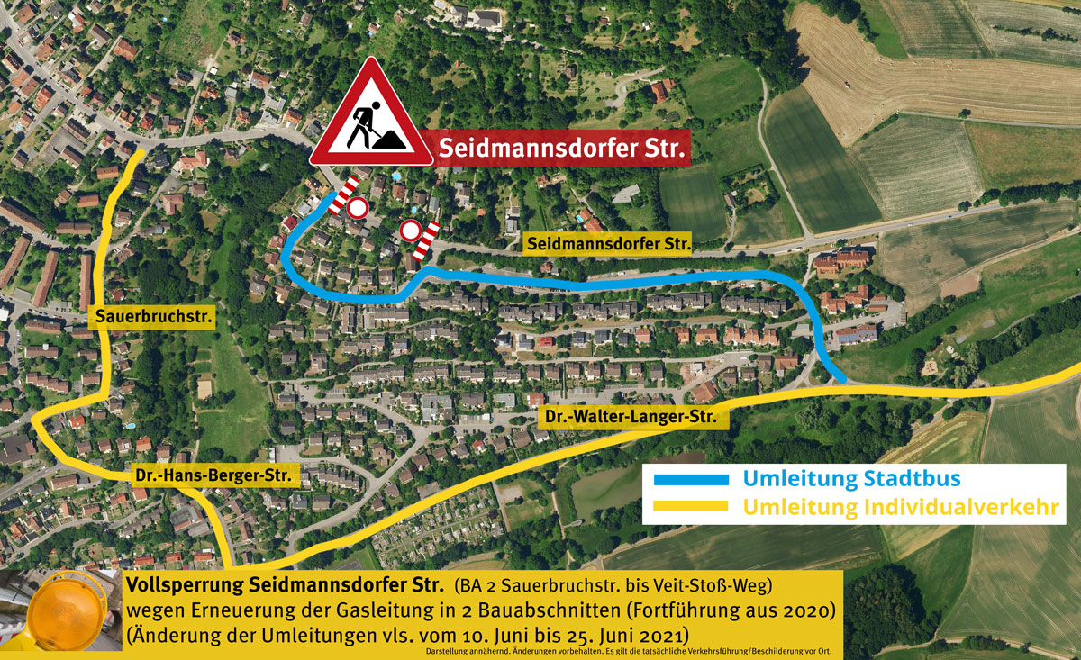 Für Arbeiten wegen Erneuerung der Gasleitung in 2 Bauabschnitten (BA) kommt es ab Donnerstag (10. Juni bis voraussichtlich 25. Juni) zur Änderung der Verkehrsführung im Bereich der Vollsperrung der Seidmannsdorfer Straße. Der 2. Bauabschnitt betrifft den Bereich von der Sauerbruchstraße bis zum Veit-Stoß-Weg.