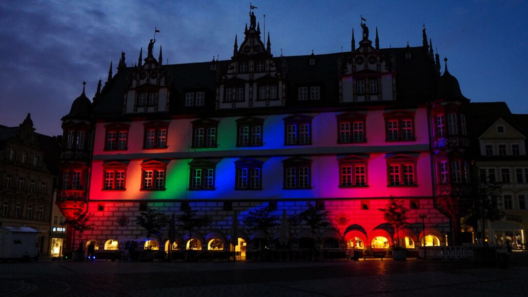 Am Mittwoch um 21 Uhr erstrahlte das Stadthaus am Markt in Regenbogenfarben. „Es ist schade, dass sich die UEFA nicht durchringen konnte, die Allianz-Arena in den Regenbogen-Farben beleuchten zu lassen. Coburg feiert die Vielfalt und Toleranz. Deshalb habe ich angeordnet, das Stadthaus bunt anstrahlen zu lassen. Wertschätzung, Respekt und – allem voran – die Wahrung der Menschenrechte sind essentiell für unsere Stadt“, erklärt Coburgs Oberbürgermeister Dominik Sauerteig dazu.