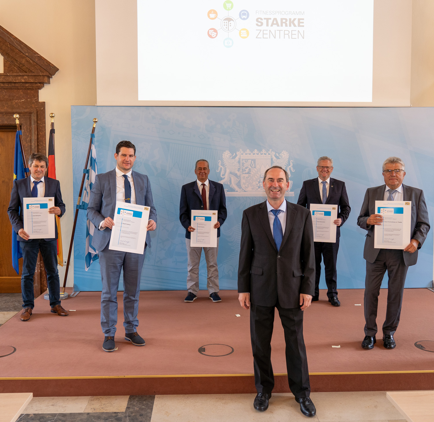 „Wir erhoffen uns vom Fitnessprogramm neue, mutige Impulse und vielseitige Einblicke in Möglichkeiten einer wirklich nachhaltigen Innenstadtentwicklung. Aber auch die enge Vernetzung mit den weiteren bayerischen Modellkommunen ist für uns wichtig, um über den eigenen Tellerrand zu blicken“, freute sich Oberbürgermeister Dominik Sauerteig, der in München die Teilnahmeurkunde von Wirtschaftsminister Hubert Aiwanger empfing. „Es braucht für die kommenden Jahre einen innovativen und integrierenden Aktionsplan aus kurz-, mittel- und langfristig angelegten Maßnahmen für unsere Innenstädte. Wenn wir in Coburg als Reallabor für andere Städte agieren können und dabei im Fitnessprogramm eine fachlich kompetente Moderation an die Seite gestellt bekommen, dann ist das in meinen Augen ein weiterer wegweisender und guter Schritt für die Zukunft unserer Coburger Innenstadt.“