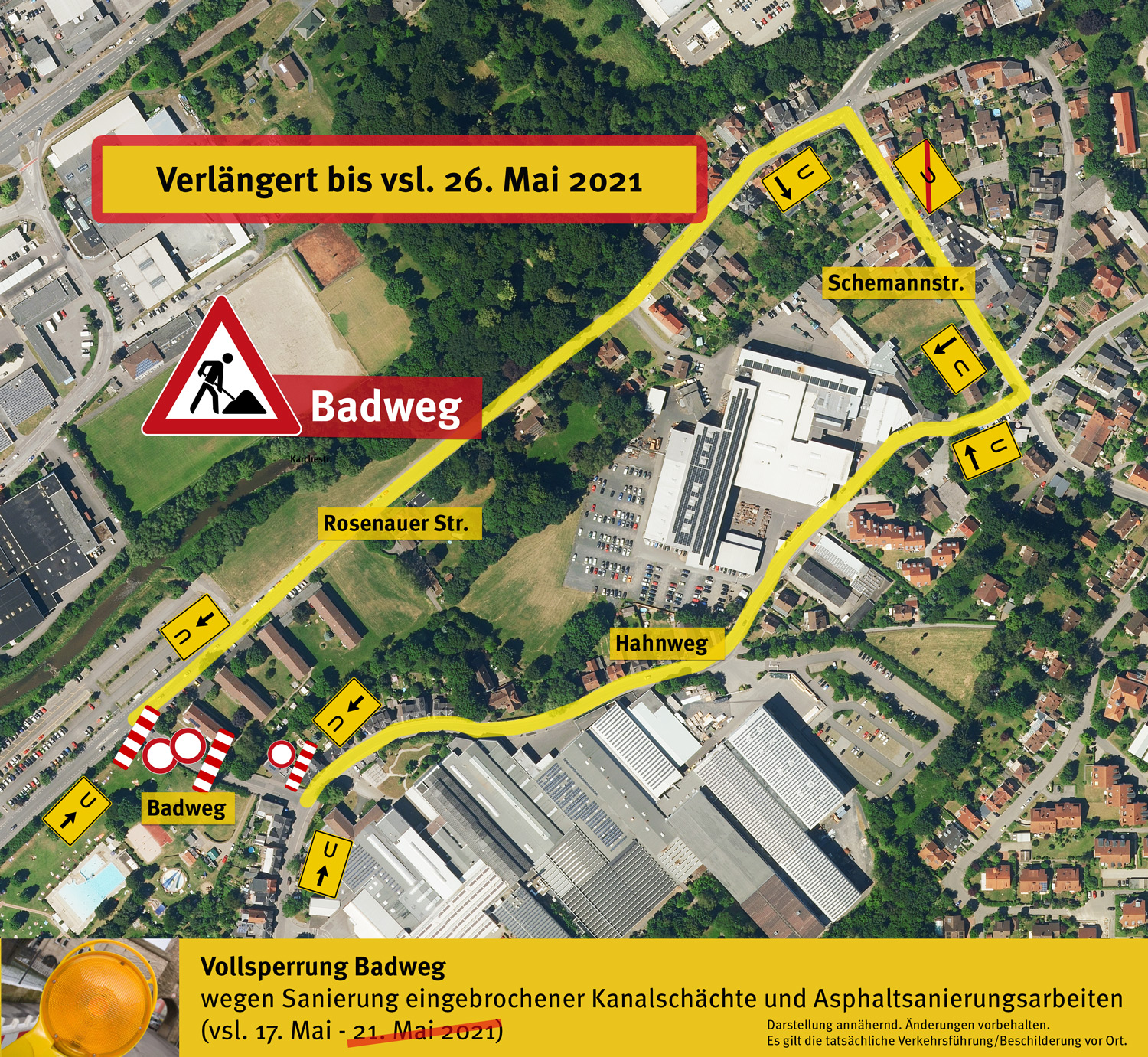 Wegen Sanierung eingebrochener Kanalschächte und Asphaltsanierungsarbeiten kommt es ab Montag (17. Mai bis vsl. 26. Mai) zur Verlängerung der Vollsperrung des Badweg.