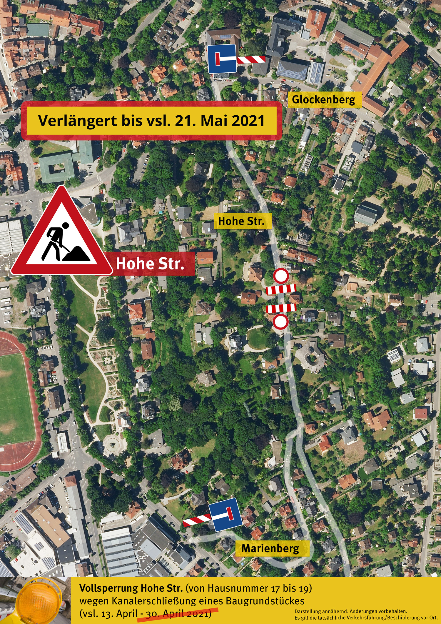Die Kanalerschließung eines Baugrundstückes erfordert ab Dienstag (13. April bis vsl. 21.Mail) die Vollsperrung der Hohe Straße (bei Hausnummer 17 bis 19).