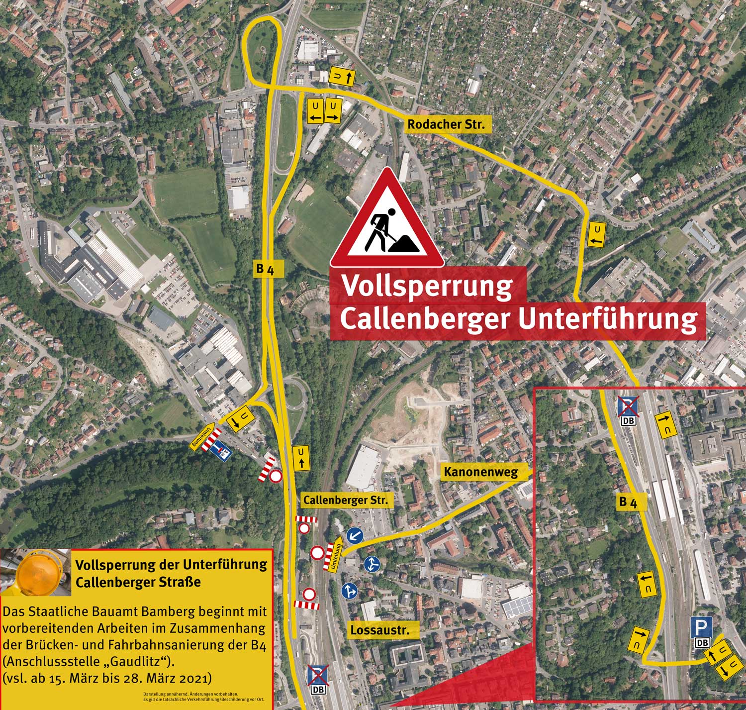 Das Staatliche Bauamt Bamberg beginnt mit vorbereitenden Arbeiten im Zusammenhang mit der Brücken- und Fahrbahnsanierung der B4 – Anschlussstelle „Gaudlitz“ (vsl. Baubeginn Ende März). - Die Umleitung in Richtung Bad Rodach erfolgt über Kanonenweg und Rodacher Straße
