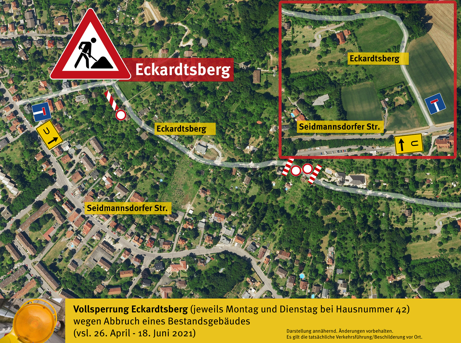 Wegen Abbruch eines Bestandsgebäudes kommt es Montag (26. April bis vsl. 18. Juni, jeweils Montag und Dienstag) zur Vollsperrung des Eckardtsberg (im Bereich Hausnummer 42).