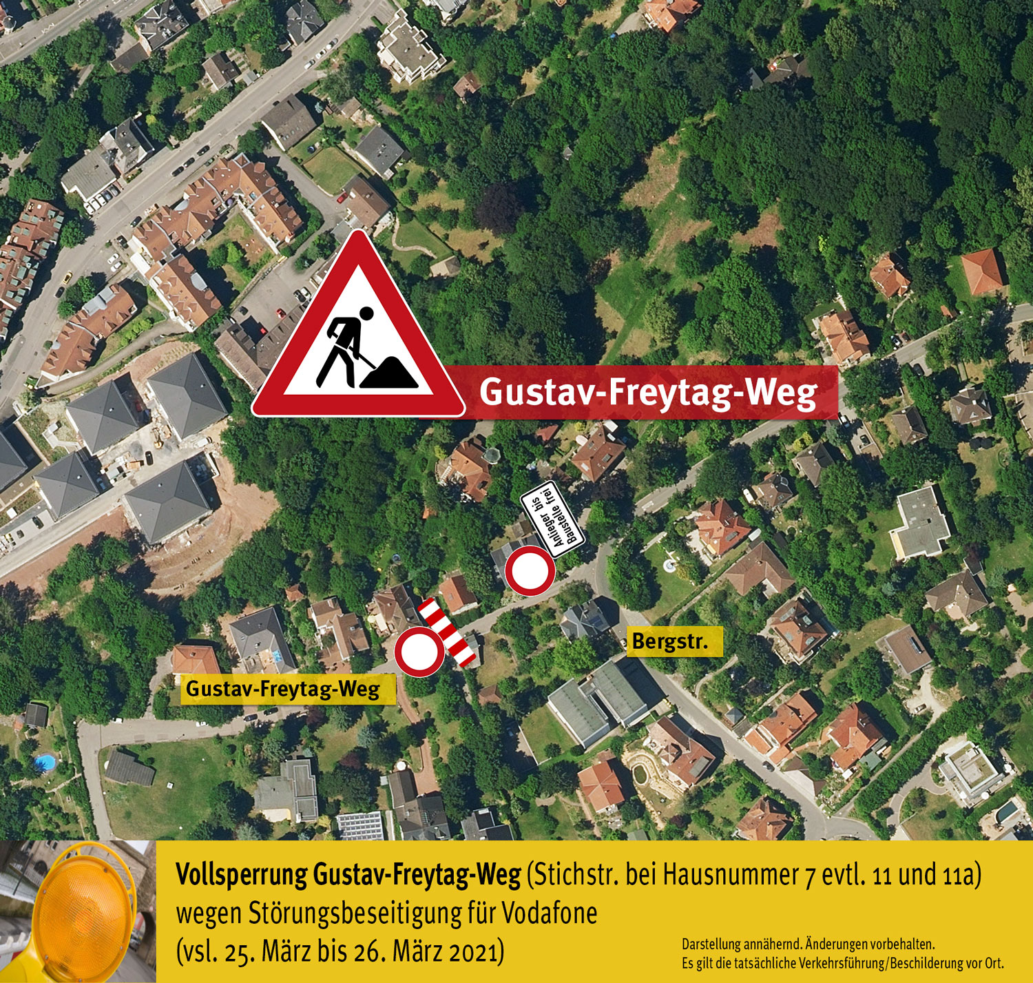 Wegen Störungsbeseitigung für Vodafone wird der Gustav-Freytag-Weg (in Höhe Hausnummer 7 und bei Bedarf auch bei den Hausnummern 11 und 11a) ab Donnerstag (25. März bis vsl. 26. März) gesperrt.