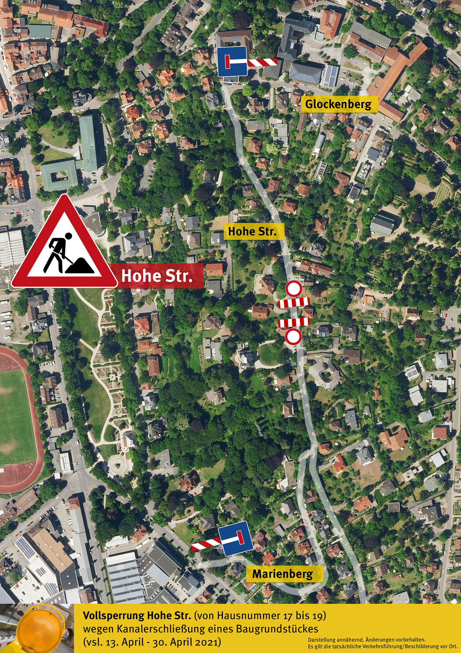 Die Kanalerschließung eines Baugrundstückes erfordert ab Dienstag (13. April bis vsl. 30. April) die Vollsperrung der Hohe Straße (bei Hausnummer 17 bis 19).