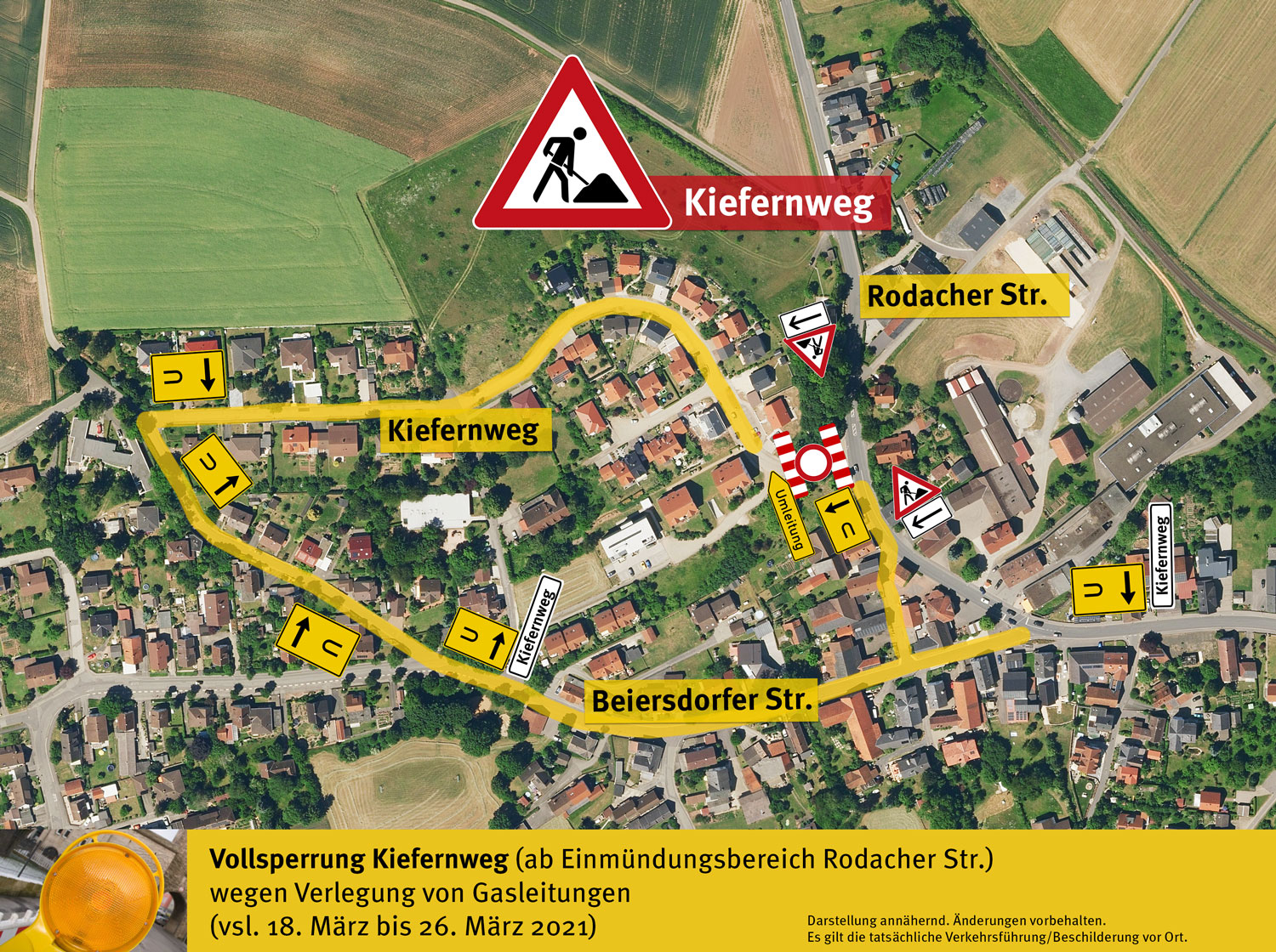 Wegen Gasleitungsverlegung wird der Kiefernweg im Einmündungsbereich von der Rodacher Str. kommend ab Donnerstag (18. März bis vsl. 26. März) gesperrt.