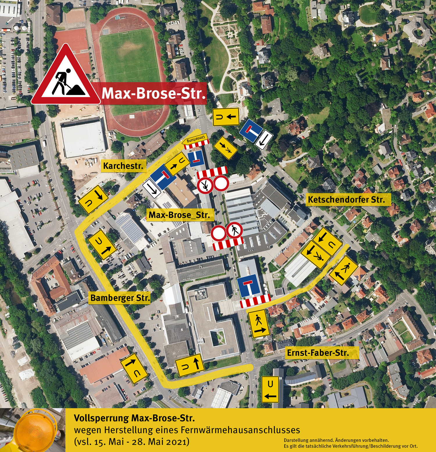 Wegen Herstellung eines Fernwärmehausanschlusses kommt es ab Samstag (15. Mai bis vsl. 28. Mai) weiterhin zur Vollsperrung der Max-Brose-Str..