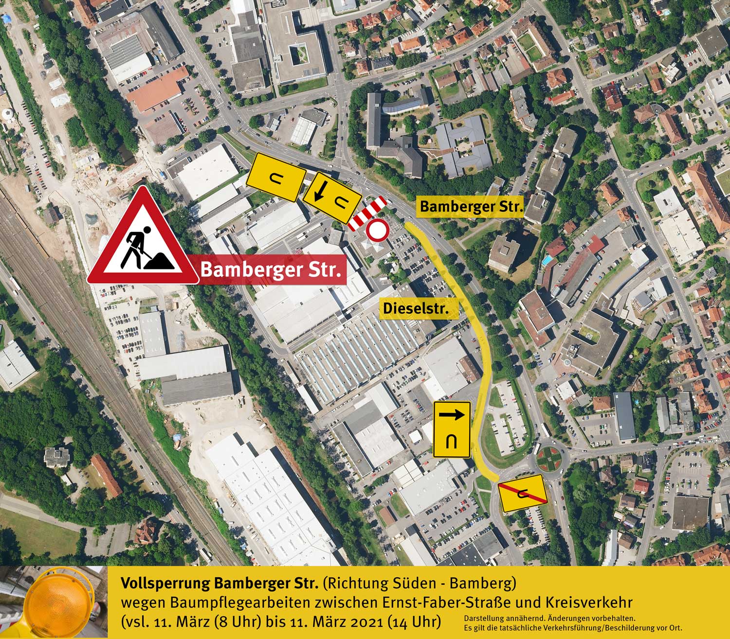 Baumpflegearbeiten erfordern am Donnerstag (11. März zwischen 8 Uhr und 14 Uhr) die Vollsperrung der Bamberger Str. zwischen Ernst-Faber-Straße und Kreisverkehr.
