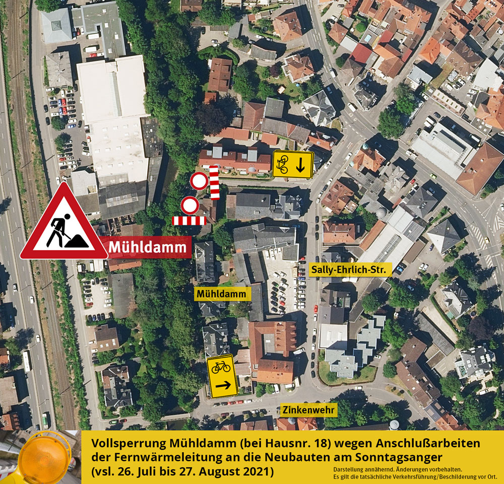 Aufgrund von Anschlußarbeiten der Fernwärmeleitung an die Neubauten am Sonntagsanger ist der Mühldamm ab Montag, 26. Juli bis vsl. 27. August 2021, bei Hausnummer 18, voll gesperrt.