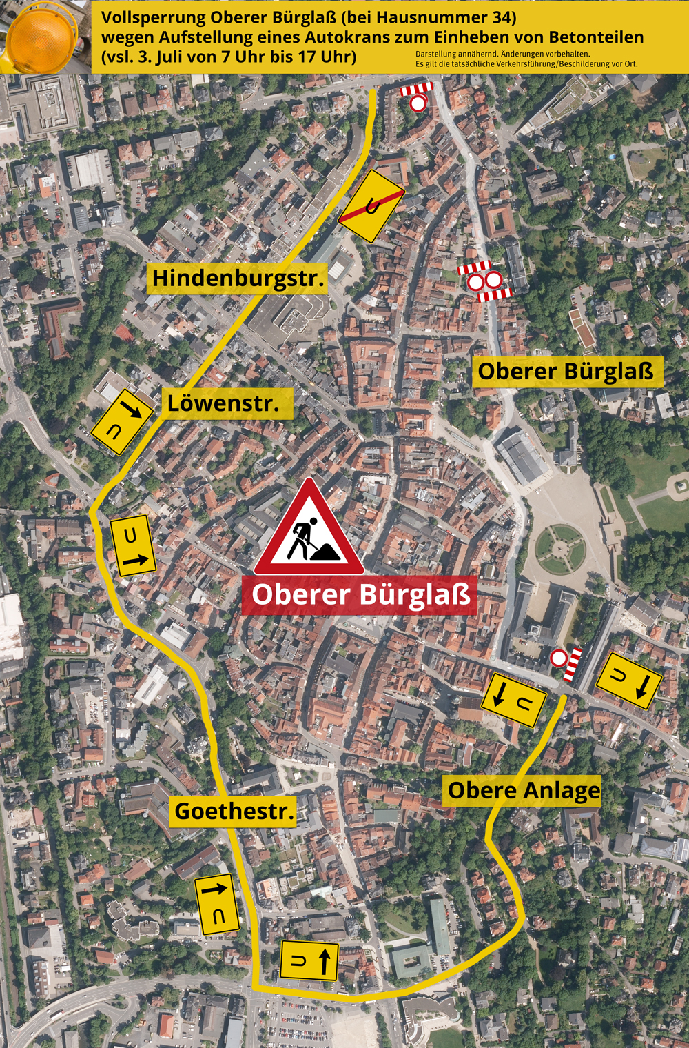 Die Umleitung erfolgt über Hindenburgstr., Löwenstr., Viktoriastr., Schützenstr. und Obere Anlage. Weitere Umleitungen sind ausgeschildert.