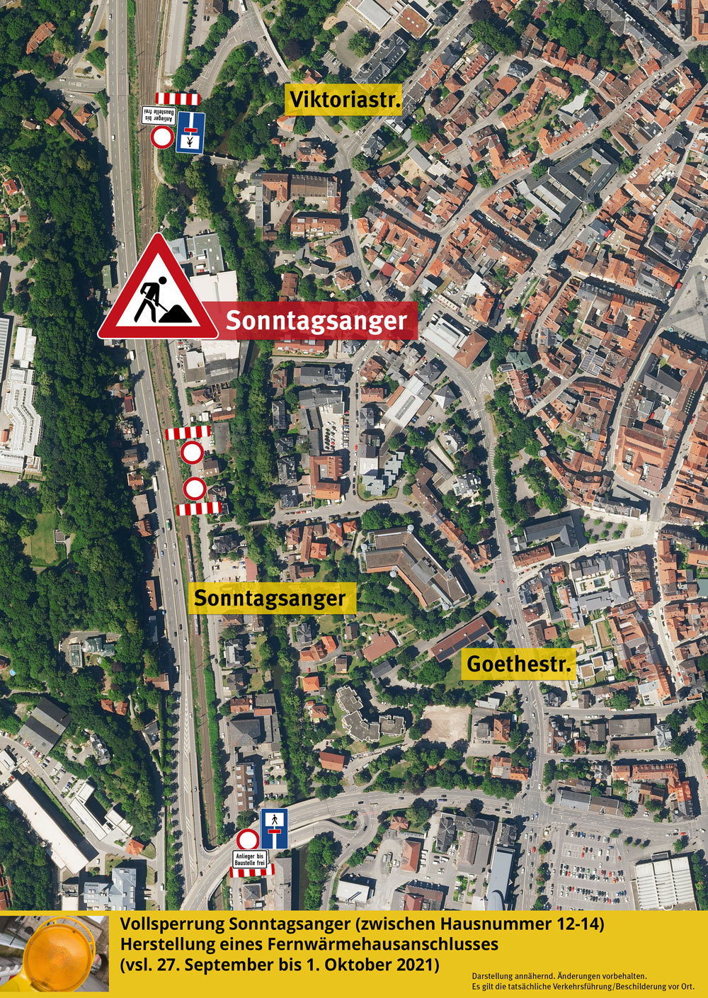 Zur Herstellung eines Fernwärmehausanschlusses wird der Sonntagsanger (zwischen Hausnummer 12-14) ab Montag (27. Sept. bis vsl. 1.Okt. 2021) gesperrt.