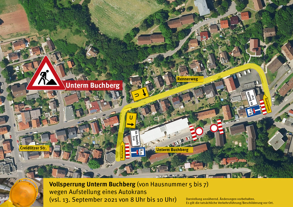 Wegen Aufstellung eines Autokrans kommt es am Montag, 13. September von vsl. 8 Uhr bis 10 Uhr zur Vollsperrung der Straße Unterm Buchberg (von Hausnummer 5 bis 7).