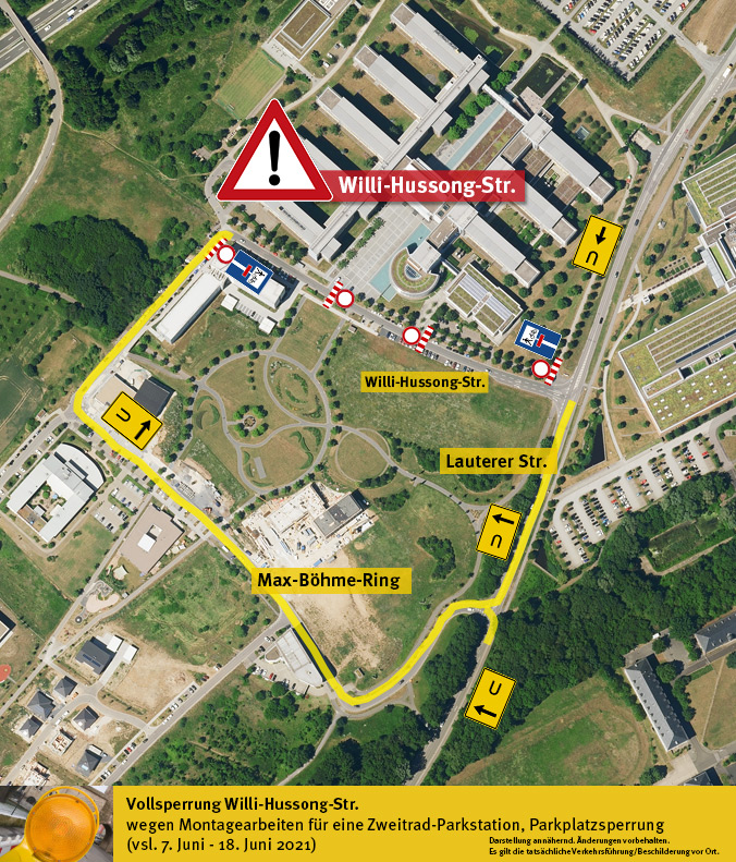 Die Montagearbeiten für eine Zweitrad-Parkstation erfordert ab Montag (7. Juni bis vsl. 18. Juni 2021) die Vollsperrung der Willi-Hussong-Str. (Fahrradhaus der HUK).