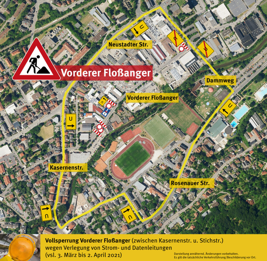 Weil Strom- und Datenleitungen sowie ein Fernwärmeanschluss gelegt werden, wird der Vorderer Floßanger zwischen Kasernen- und Stichstraße vom 3. März bis 2. April gesperrt. Die Umleitung erfolgt über Kasernenstraße, Wiesenstraße, Rosenauer Straße, Dammweg oder über Dammweg, Neustadter Straße und Kasernenstraße.