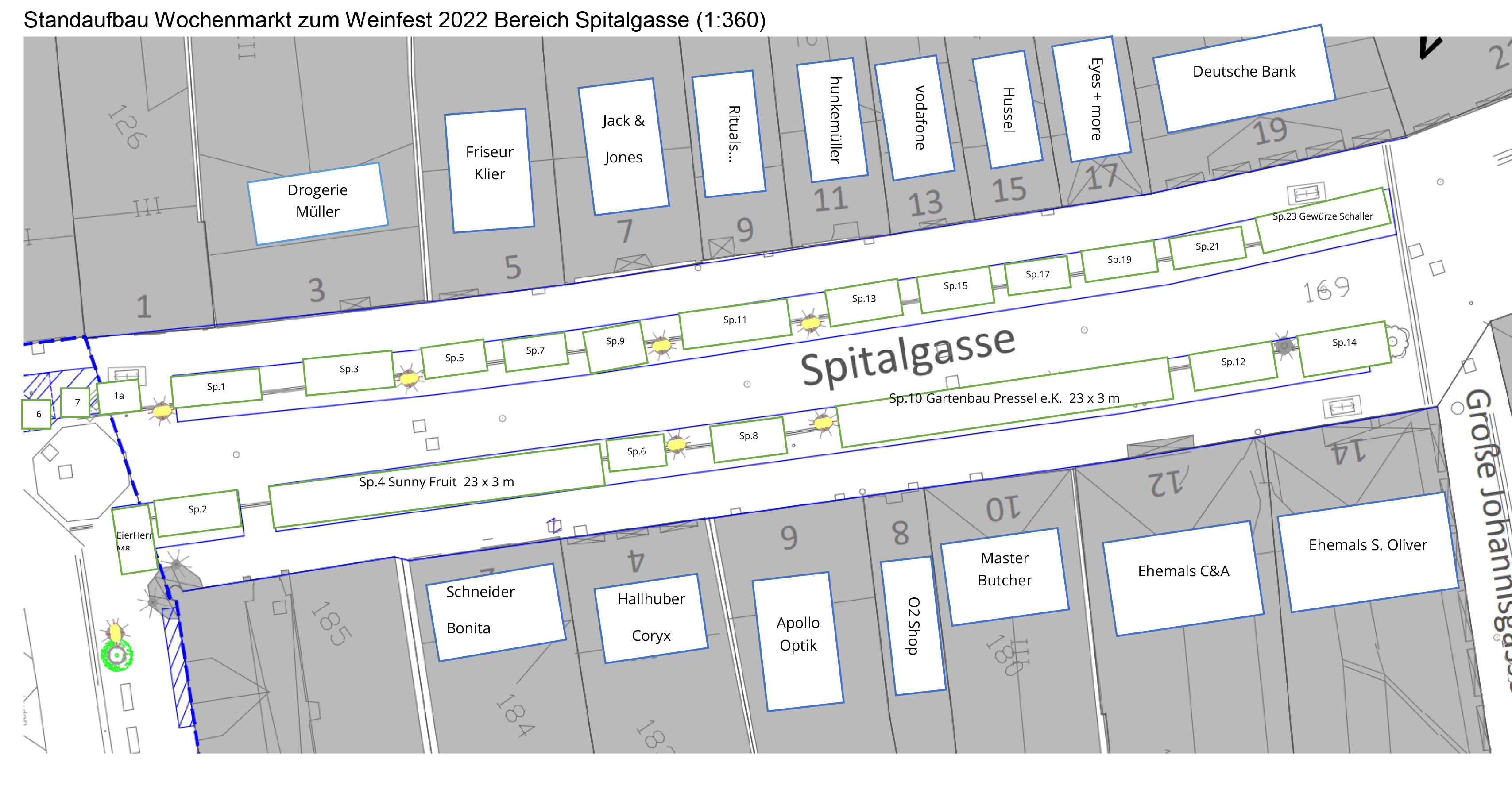Auch wenn sich am Markt rund um den Albert alles um den Wein dreht, müssen Sie nicht auf Ihren Einkauf am Wochenmarkt verzichten. Die Marktstände ziehen einfach ein Stück weiter in die Fußgängerzone. Zwischen Markt und Großer Johannisgasse werden alle am Samstag (14. Mai) ihren Platz finden. Wer gezielt zum Stammmarkthändler/in gehen möchte, kann sich in der Grafik unten und dem Programmheft des Weinfestesüber die den Standort vorab informieren. Der Gemüsemarkt am Freitag (13.4.) wird sich am Rande des Weinfest aufbauen – beste Gelegenheit Ihren Marktbesuch mit einem Glas Wein abzurunden.